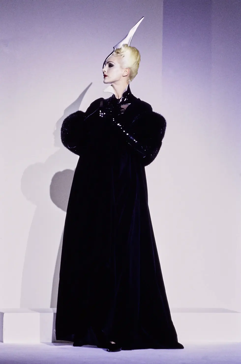 In 1996, Mugler opened the Paris spring/summer ready-to-wear shows with a collection that received mixed reactions. It featured giant eye-covering hats for a touch of humor, alongside classic black and white outfits, short black skirts, revealing body stockings, and see-through gowns.